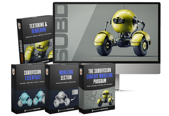 Complete modeling workflow & training, where we’ll piece everything together by creating a hard surface bot completely from scratch with quad-based topology. All shown in step-by-step video lessons